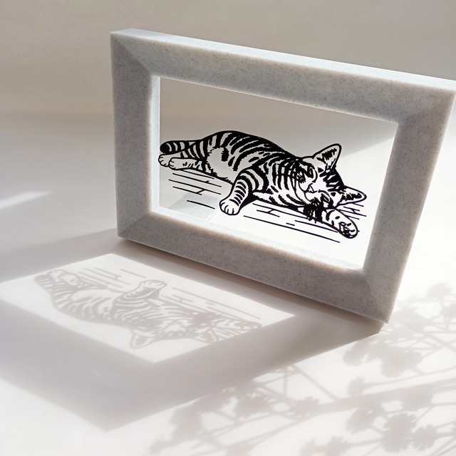 アクリルの透明感と切り絵のような繊細なタッチのアートです。 シンプルながら印象的で、リビングや玄関のインテリアにぴったり。 棚などに立て掛けでも、壁にピン(別売)を打って壁掛けでも、お好みの方法で飾れます。 フレームは6種類ご用意しています。お好きなデザインを選んでください。 ◆商品のサイズ感目安 立て掛け時:W18cm × H13cm × D7cm(スタンド含む) ※額縁デザインによって外形寸法が異なります。上記は目安とお考えください。 ◆素材 額縁:PLA樹脂 / 絵:PLA樹脂 / プレート:アクリル樹脂 ※ご購入前に「SHOPPING GUIDE」をご一読ください。