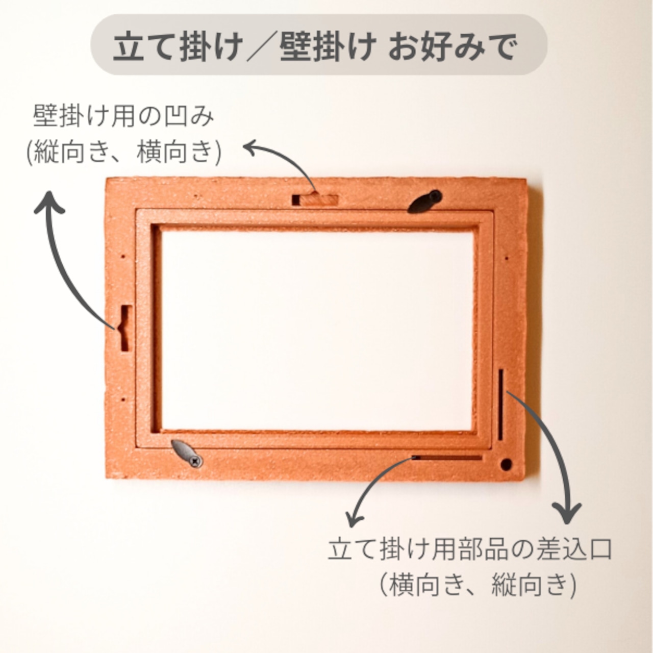 棚などに立て掛けでも、壁にピン(別売)を打って壁掛けでも、お好みの方法で飾れます。
