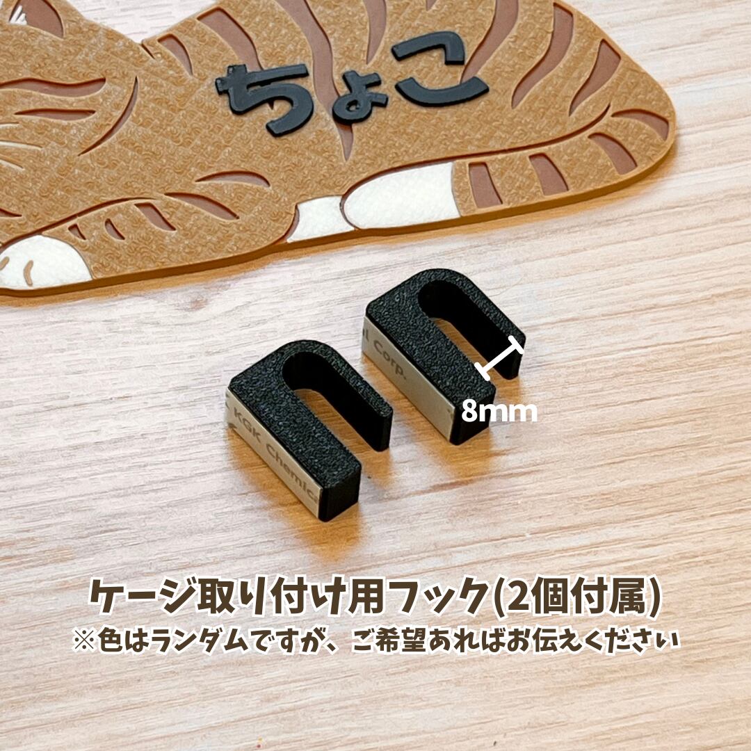 ・ケージにつける場合は、プレート裏面に付属のフックを貼り、引っ掛けてください。